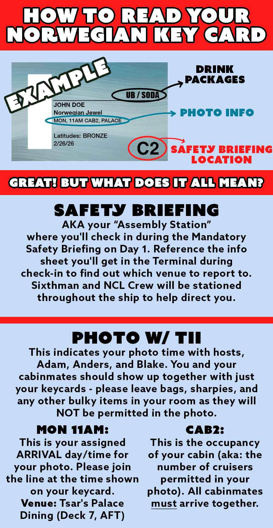 Once on board, immediately report to your assigned Assembly Station (aka Muster Station) with your keycard to physically check in. Norwegian staff and Sixthman Crew will be around to direct you to the proper location. Checking in at this location is required so that you know the PHYSICAL location of where you will need to go if an emergency happens while sailing.